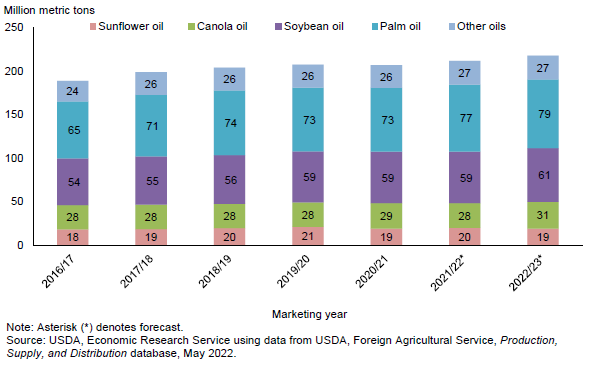 Прогнозируется, что мировое потребление растительных масел достигнет 212,92 млн метрических тонн, при этом глобальное продовольственное потребление увеличится на 3,48 млн метрических тонн, а промышленное – на 2,47 млн метрических тонн, включая биотопливо. Ожидается, что остатки основных растительных масел увеличатся с минимального уровня в 2021/22 году до 28,13 млн тонн.