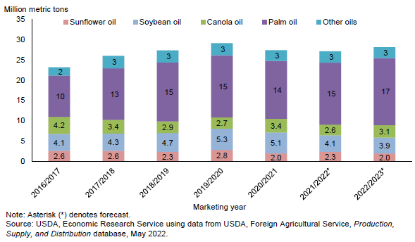 Прогнозируется, что в 2022/23 году мировое производство пальмового масла увеличится на 2,18 миллиона метрических тонн, или на 2,8 процента, до 79,13 миллиона метрических тонн. Ожидается, что на Индонезию и Малайзию придется 46,5 и 19,8 млн метрических тонн соответственно. Ожидается, что при росте доступности пальмового масла мировое потребление пальмового масла увеличится в 2022/23 году на 1,9 миллиона метрических тонн, или на 2 процента, до 76,48 миллиона метрических тонн. В результате мировой экспорт пальмового масла, по прогнозам, вырастет на 4% в следующем сезоне, до 51,33 млн метрических тонн, при этом на Индонезию придется 90% роста торговли. Ожидается, что рост спроса на пальмовое масло не превысит ожидаемый рост предложения, поэтому прогнозируется, что мировые остатки пальмового масла увеличатся на 1,6 млн метрических тонн до 16,5 млн метрических тонн на конец 2022/23 маркетингового года.
