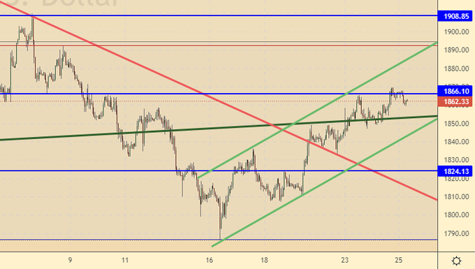 Продолжается битва в районе 1860. Если покупатели не смогут пройти выше 1870, то им придется бежать с рынка, так как ход к 1740 пока остается одной из основных идей. Спрос на доллар останется на высоком уровне в этом году благодаря росту процентных ставок в США.