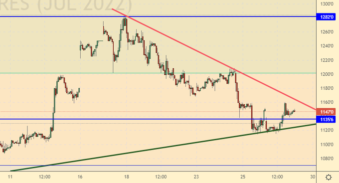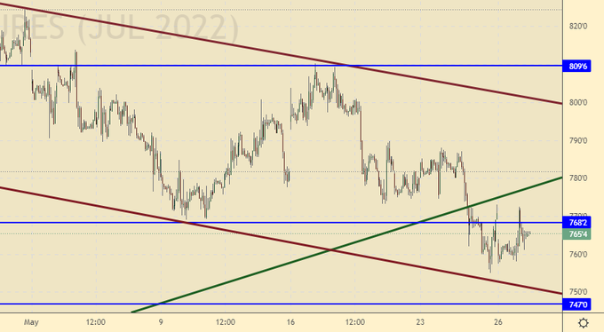 Рынок пришел к нижней границе падающего канала и теперь хочет немного передохнуть. Спуститься к 700.0 мы можем. Более сильное падение в текущих напряженных условиях в Черноморском регионе не просматривается.