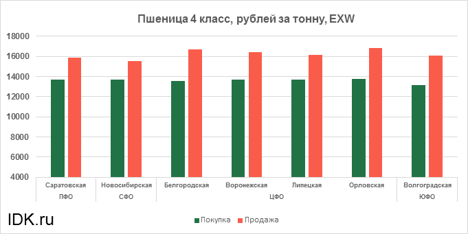 За прошедшую неделю с 23.05.2022 по 27.05.2022 средняя цена на пшеницу 4-го класса, согласно выставленным заявкам трейдеров, упала по всем округам на 409 рублей. Средняя цена составляет 14757 рублей за тонну.