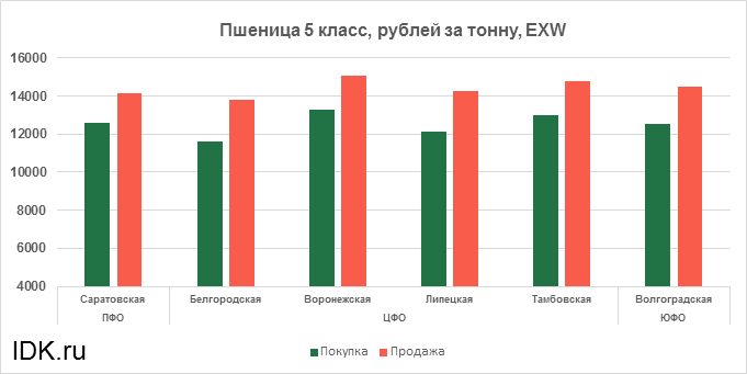 За прошедшую неделю с 23.05.2022 по 27.05.2022 средняя цена на пшеницу 5-го класса, согласно выставленным заявкам трейдеров, упала по всем округам на 780 рублей. Средняя цена составляет 13481 рубль за тонну.