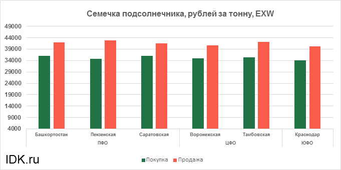 За прошедшую неделю с 23.05.2022 по 27.05.2022 средняя цена семечки подсолнечника, согласно выставленным заявкам трейдеров, упала по всем округам на 2309 рублей. Средняя цена составляет 38084 рубля за тонну.