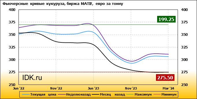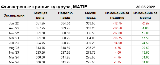 На 30.05.2022 стоимость кукурузы на бирже MATIF по контракту Jun ’22 составила 351.25 евро за тонну. За прошедшую неделю стоимость кукурузы на европейской площадке упала на 12.75 евро/тонна. Как мы видим на графике, фьючерсная кривая имеет периоды, когда более дальний фьючерс дешевле ближнего. Состояние бэквардации наблюдаем на следующих контрактах: Nov ’22; Aug ’23; Nov ’23. Таким образом, трейдеры предполагают, что возможно превалирование предложения над спросом в указанные периоды.