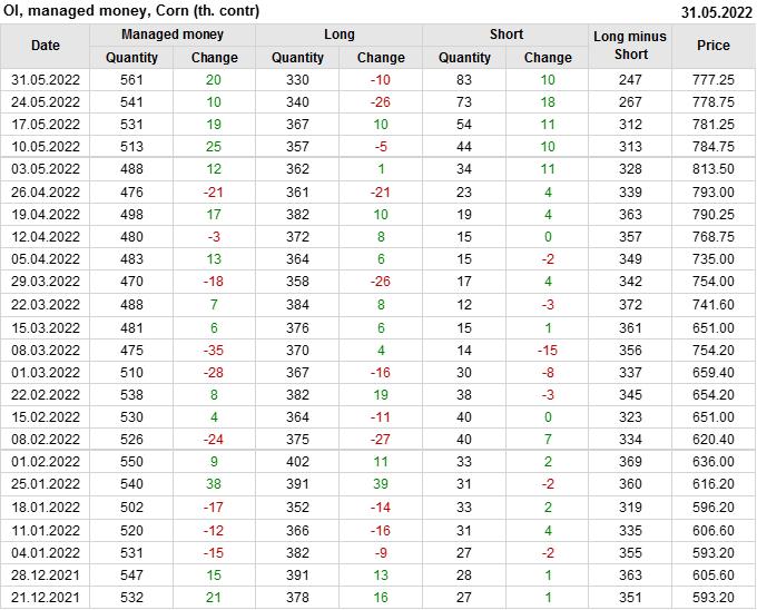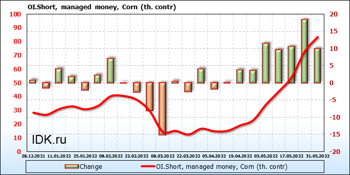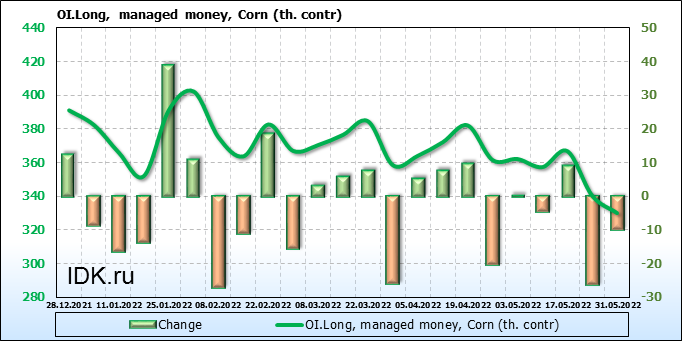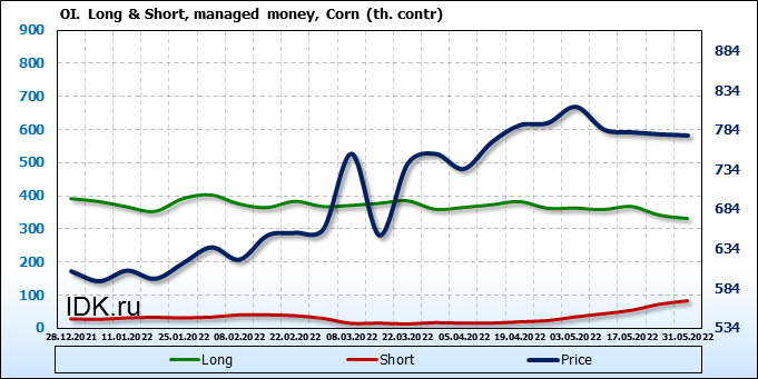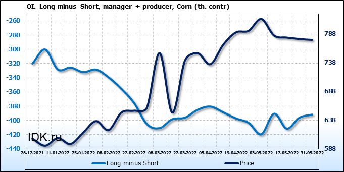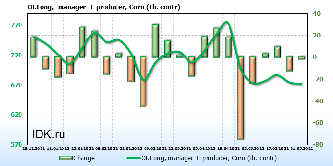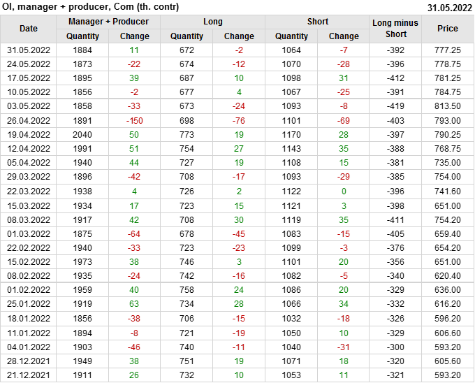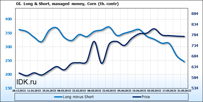 За прошлую неделю, 25.05.22 — 31.05.22, разница между длинными и короткими позициями управляющих сократилась на 20.8 тыс. контрактов. В тоже время, цена упала на 1.5 цента.