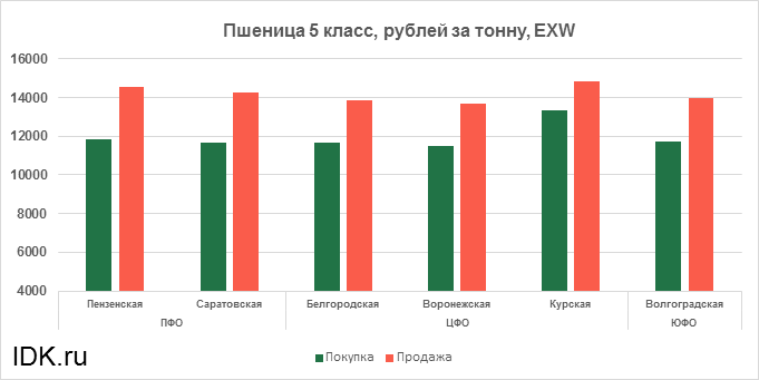 За прошедшую неделю с 30.05.2022 по 03.06.2022 средняя цена на пшеницу 5-го класса, согласно выставленным заявкам трейдеров, упала по всем округам на 560 рублей. Средняя цена составляет 12921 рубль за тонну.