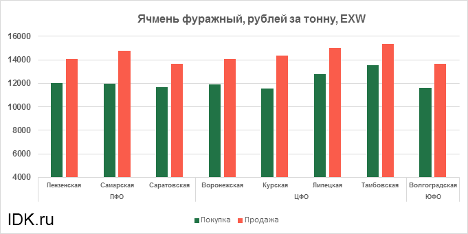 За прошедшую неделю с 30.05.2022 по 03.06.2022 средняя цена на фуражный ячмень, согласно выставленным заявкам трейдеров, упала по всем округам на 416 рублей. Средняя цена составляет 12961 рубль за тонну.