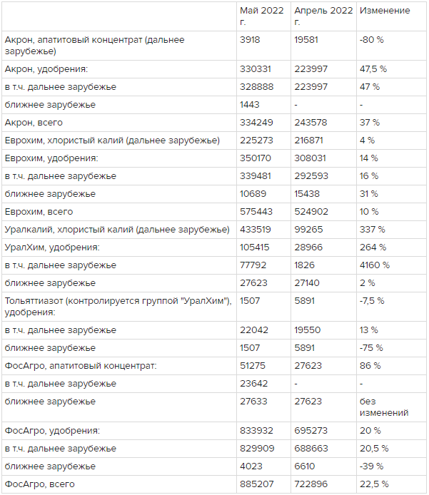 За 5 месяцев 2022 года экспорт удобрений из России просел на 24% год к году, до 12,5 млн тонн. Экспорт через порты снизился на 5%, до 8,6 млн тонн, через погранпереходы — упал почти на 48%, до 3,9 млн тонн.