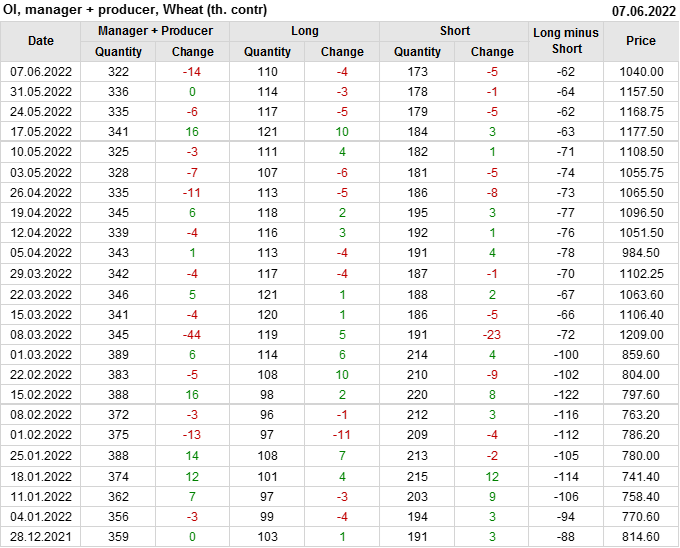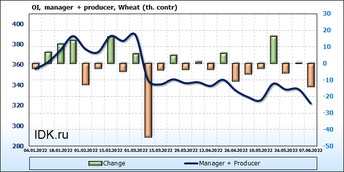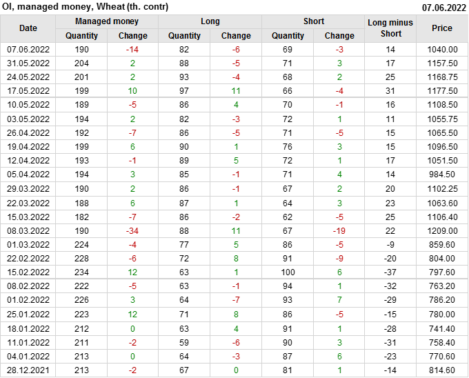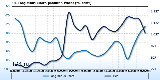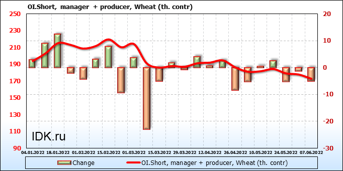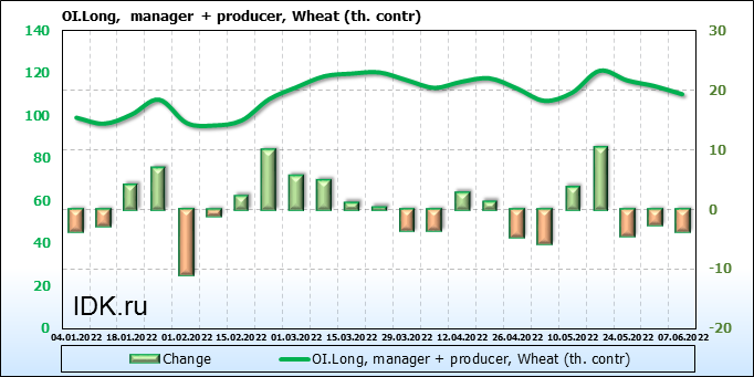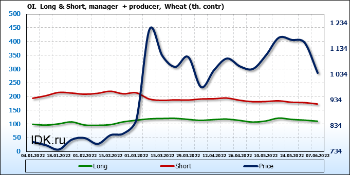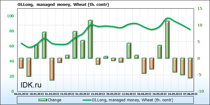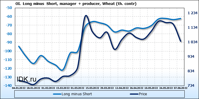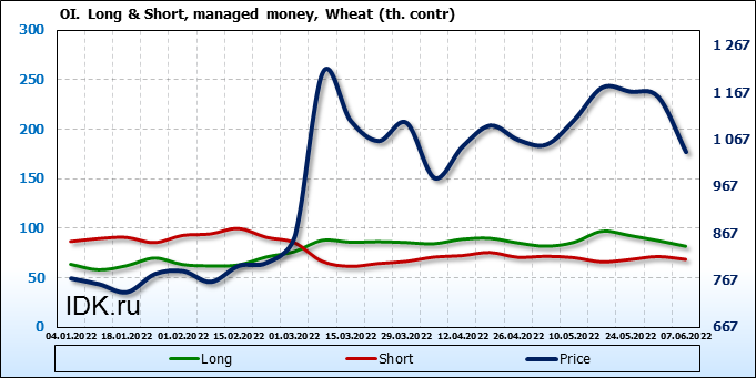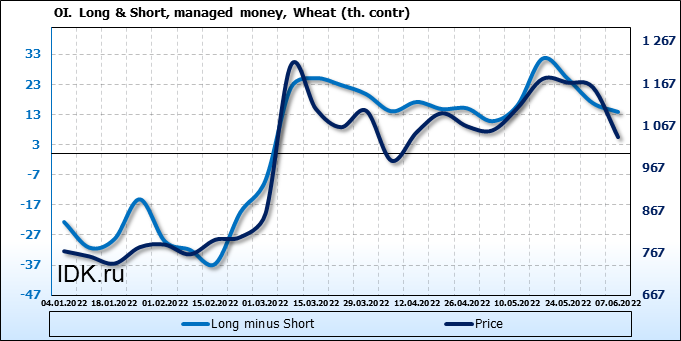 За прошедшую неделю, 01.06.22 — 07.06.22, разница между длинными и короткими позициями управляющих сократилась на 2.9 тыс. контрактов. В тоже время, цена упала на 117.5 цента.