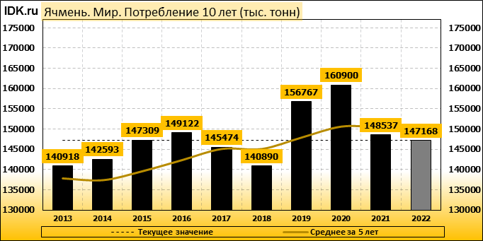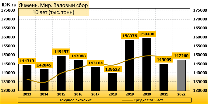 Согласно июньскому отчету МСХ США, прогноз мирового производства ячменя в 2022/23 году снижен на 1,71 млн. тонн или 1,15 процента по сравнению с прошлым месяцем до 147,26 млн. тонн. При этом прогноз производства сильнее всего снижен для Европейского Союза – на 0,80 млн. тонн (1,52 процента) до 51,70 млн тонн, для Австралии – на 0,50 млн тонн (4,35 процента) до 11 млн тонн и для Украины – на 0,30 млн тонн (5 процентов). Это частично компенсируется лишь повышением прогноза для Соединенного Королевства – на 0,20 млн тонн ( 2,92 процента).