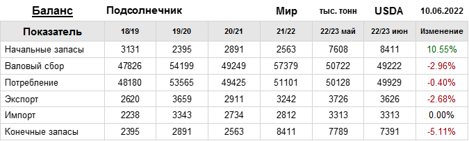 За прошедший месяц министерство сельского хозяйства США (USDA) на 10.06.2022 пересмотрело Баланс подсолнечника для Мира в сезоне 22/23 следующим образом: