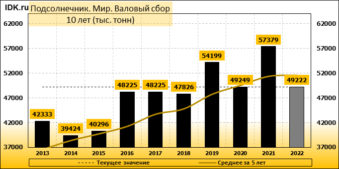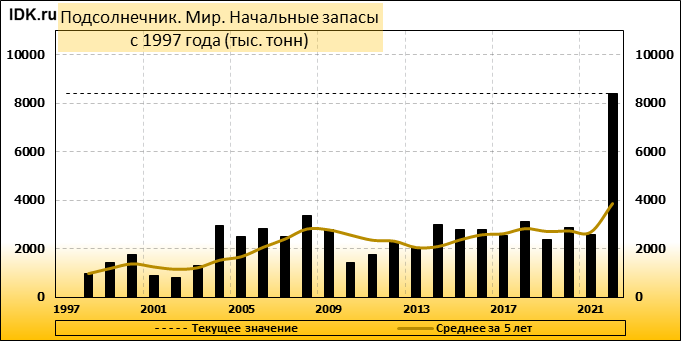 Согласно июньскому отчету МСХ США, мировое производство подсолнечника в 2022/23 году сокращено на 1,50 млн. тонн или 2,96 процента по сравнению с предыдущим месяцем до 49,22 млн. тонн. Сокращение полностью приходится на Украину, прогноз для которой снижен с 11,00 до 9,50 млн. тонн. Экспорт подсолнечного масла и шрота из Украины в 2022/23 году снижен на 200 тыс. тонн для каждого продукта вслед за снижением производства. Мировые конечные остатки подсолнечника в 2022/23 году снижены с 7,6 млн. тонн до 7,4 млн. тонн.