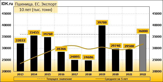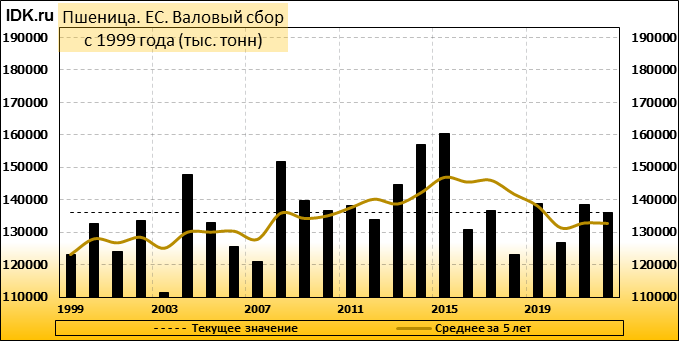 Производство пшеницы в 2022/23 маркетинговом году в Европейском союзе оценивается в 136,1 млн метрических тонн, что на 0,4 млн тонн меньше, чем ожидалось в прошлом месяце, на 2,3 млн тонн (2 процента) меньше по сравнению с прошлым годом, но на 3 процента превышает средний показатель за 5 лет в 132,7 млн тонн. Уборочная площадь оценивается в 24,1 млн га, без изменений по сравнению с прошлым месяцем, на 0,1 млн га меньше, чем в прошлом году, но на 0,2 млн га больше, чем в среднем за 5 лет. Урожайность оценивается в 5,65 тонны с гектара, что на 1 процент ниже прошлогоднего уровня, но на 2 процента больше, чем в среднем за 5 лет.