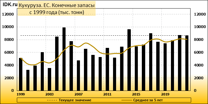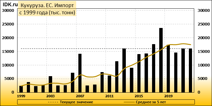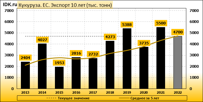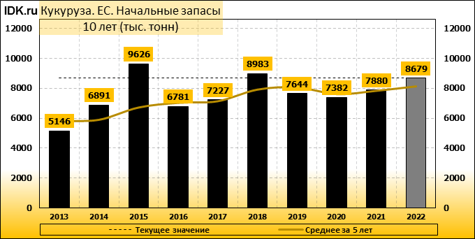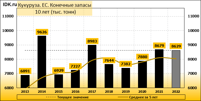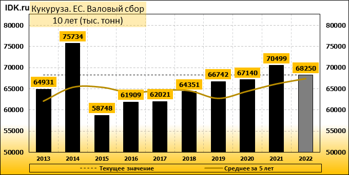 Производство кукурузы в Европейском союзе (ЕС) в 2022/23 маркетинговом году прогнозируется без изменений по сравнению с прошлым месяцем — на уровне 68,25 млн метрических тонн, что на 2,25 млн тонн или 3,2 процента меньше оценки на 2021/22 МГ. Урожайность прогнозируется на уровне 7,53 тонны с гектара, что на 1,5 процента меньше, чем в предыдущем году. Уборочная площадь прогнозируется на уровне 9,07 млн га, по сравнению с 9,21 млн га в прошлом году. Прогноз импорта кукурузы в ЕС в 2022/23 году повышен на 1 млн. тонн до 16 млн. тонн.