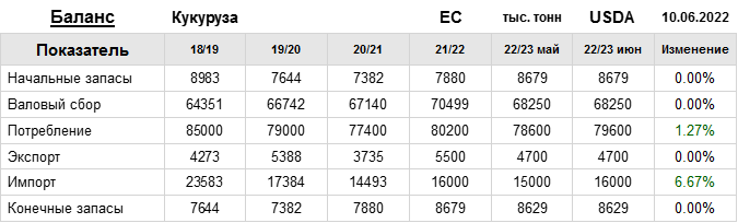 За прошедший месяц министерство сельского хозяйства США (USDA) на 10.06.2022 пересмотрело Баланс кукурузы для ЕС в сезоне 22/23 следующим образом: