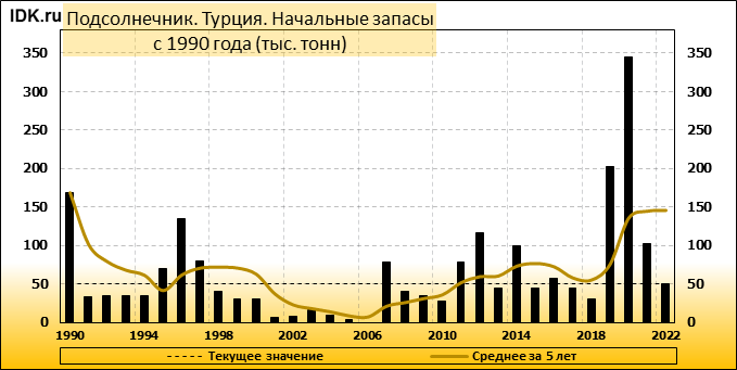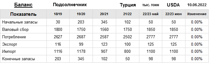 За прошедший месяц министерство сельского хозяйства США (USDA) на 10.06.2022 пересмотрело Баланс подсолнечника для Турции в сезоне 22/23 следующим образом: