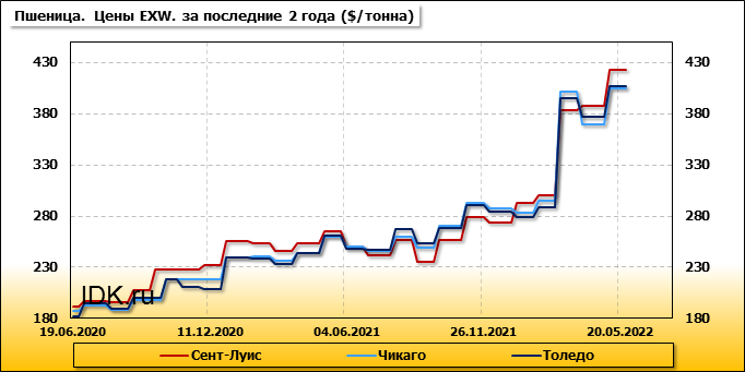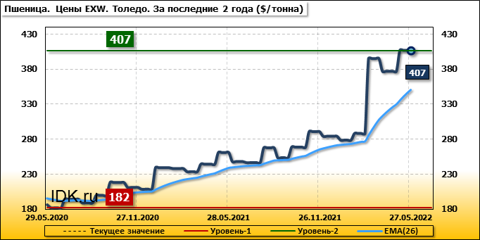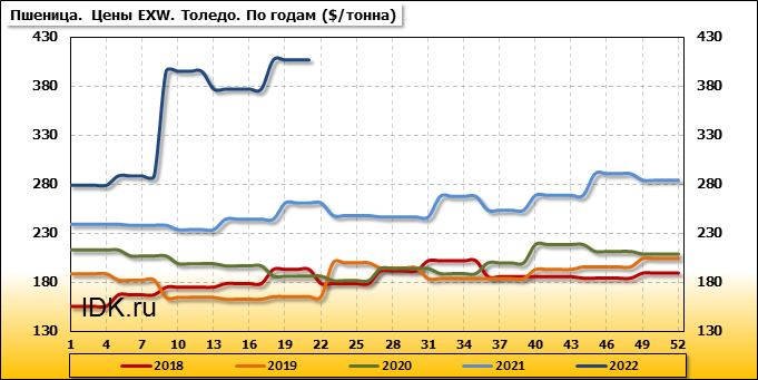 Внутренние цены на пшеницу SRW в городе Толедо (США) выросли на 29.8 $/т. и на отчетный месяц составляют 406.64 доллара за тонну.