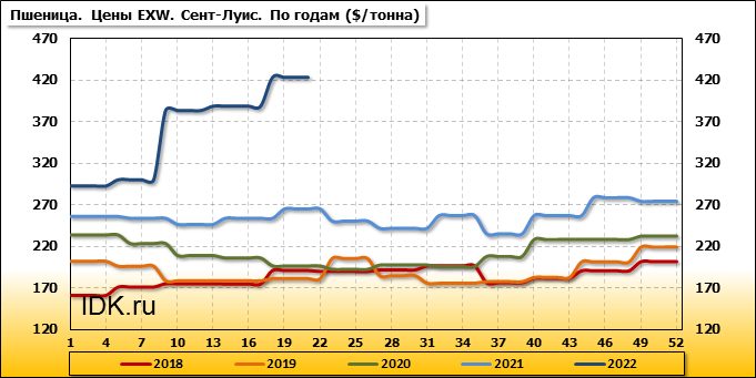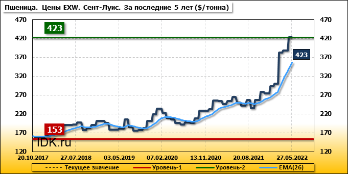 За прошедший месяц внутренние цены на пшеницу SRW в Сент-Луисе (США) выросли на 34.6 $/т. и на отчетный месяц составляют 422.83 доллара за тонну.