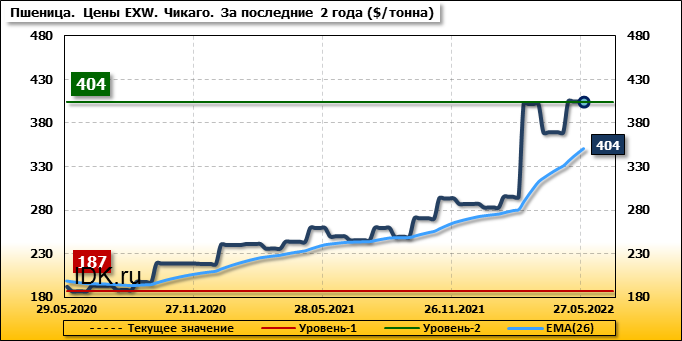 По итогам торгового дня июльские котировки мягкой озимой пшеницы на Чикагской бирже (СВОТ) поднялись до — $396,18 за тонну, фьючерсы твердой озимой пшеницы KCBT в Канзас-Сити до — 421,99 за тонну, июльские фьючерсы твердой яровой пшеницы MGEХ — до $444,22.