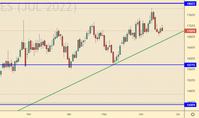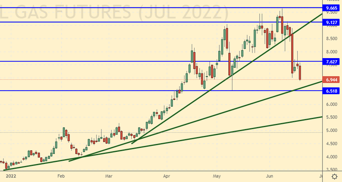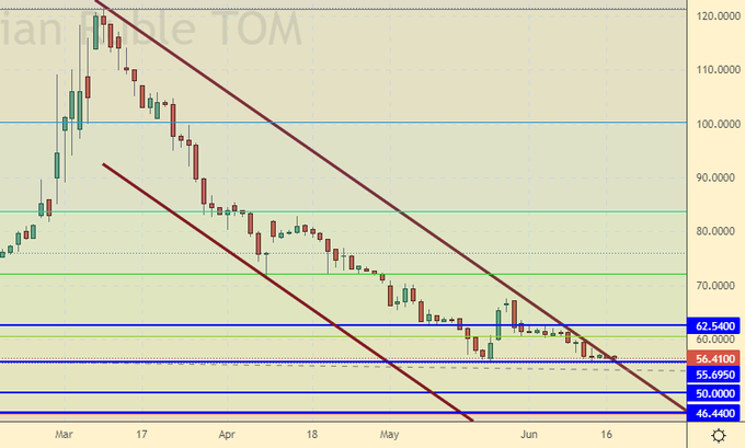 Сценарий роста: рассматриваем июльский фьючерс, дата экспирации 28 июня. Вполне понятное снижение цен. При подходе к 5.500 можно думать о покупках.