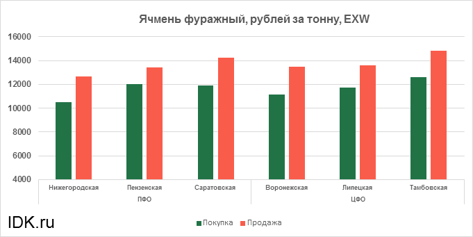 За прошедшую неделю с 13.06.2022 по 17.06.2022 средняя цена на фуражный ячмень, согласно выставленным заявкам трейдеров, упала по всем округам на 355 рублей. Средняя цена составляет 12775 рублей за тонну.