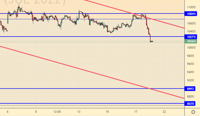 После выходного в понедельник в США, фьючерс открылся падением. Ушли ниже 1027.0, что создает предпосылки для падения к 860.0.