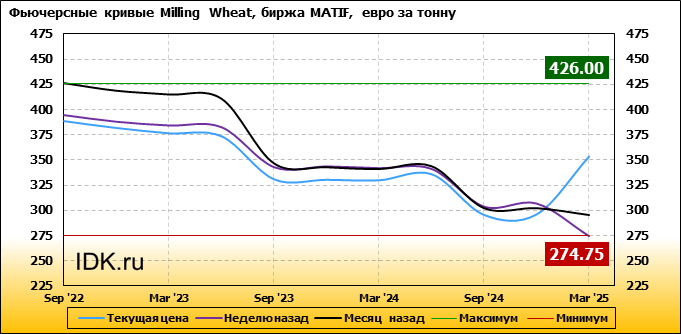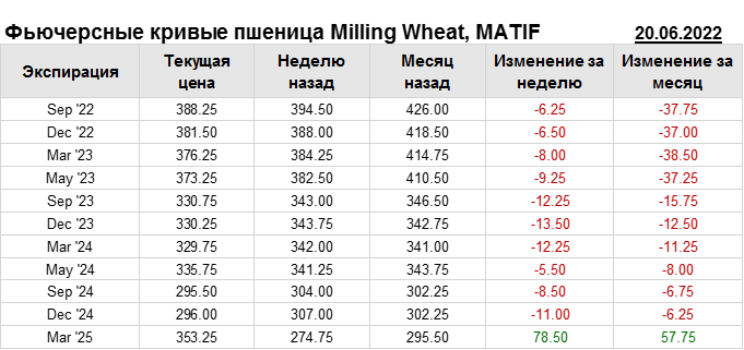 На 20.06.2022 стоимость пшеницы Milling Wheat на бирже MATIF по контракту Sep ’22 составила 388.25 евро за тонну. За прошедшую неделю стоимость пшеницы Milling Wheat упала на 6.25 евро/тонна. Как мы видим на графике, фьючерсная кривая имеет периоды, когда более дальний фьючерс дешевле ближнего. Состояние бэквардации наблюдаем на следующих контрактах: Dec ’22; Mar ’23; May ’23; Sep ’23; Dec ’23; Mar ’24; Sep ’24. Таким образом, трейдеры предполагают, что возможно превалирование предложения над спросом в указанные периоды.
