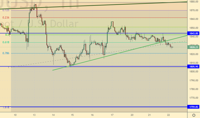 Так как фондовый рынок в США решил не обострять текущее положение дел и несколько вырос, золото будет оставаться под давлением. Ждем снижения, для начала к уровню 1800, затем 1760.