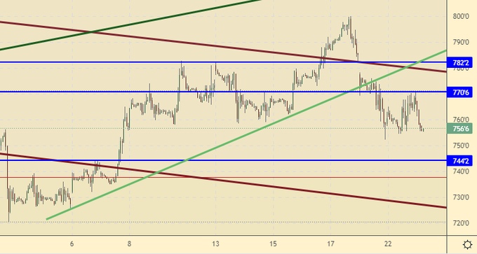 Крайне неохотно рынок идет вниз. Уже на уровне 744.0 можно ждать покупателей. В целом, мы не отрицаем возможности хода к 650.0, но данную отметку логичнее было бы увидеть к началу сентября.