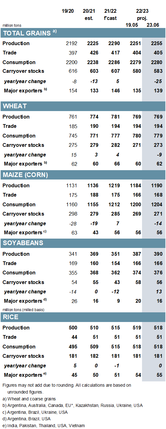 Прогнозируется, что общий объем производства зерна в 2022/23 году сократится на 2% по сравнению с прошлым годом до 2 255 млн тонн, из-за меньшего объема производства кукурузы (-29 млн) и пшеницы (-12 млн). В то время как перспективы потребления неоднозначны, прогнозируемый спад спроса на корма может привести к снижению общего потребления до 2 280 млн тонн. При сравнительно более резком падении предложения мировые переходящие запасы сокращены на 4% до 583 млн тонн. При сохранении сложностей логистики в Черном море мировая торговля может сократиться еще на 3% до 405 млн тонн.
