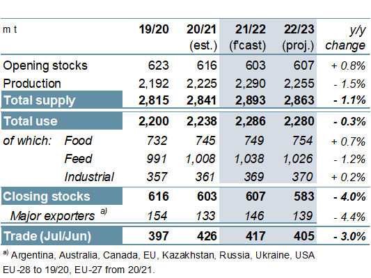 Исключительно из-за увеличения урожая кукурузы и пшеницы общий объем производства зерна в 2021/22 году прогнозируется на 3% выше, чем в прошлом году. Поскольку прирост предложения опережает рост потребления, прогнозируется, что остатки на конец сезона увеличатся на 1% до 607 млн тонн, что станет первым их увеличением с 2016/17 г., главным образом за счет роста в Украине. Прогнозируется, что объем мировой торговли, отчасти в связи с сокращением черноморских экспортных потоков, сократится до 417 млн тонн (-2%).