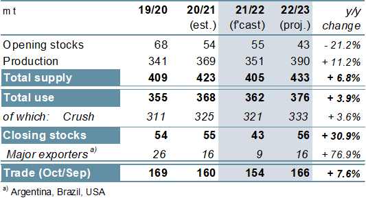 В сезон, когда урожай в Южной Америке значительно сократился, мировое производство сои в 2021/22 году, по оценкам, упало на 18 млн тонн год к году. На фоне ограничения предложения ожидается, что потребление и торговля сократятся по сравнению с прошлым годом, а остатки снизятся. В связи с увеличением посевных площадей и ростом урожайности в южном полушарии объем производства может сильно вырасти в 2022/23 году на 11% в годовом исчислении. Благодаря переработке в Азии и Южной Америке глобальное потребление ожидается на пике, в то время как Совет видит потенциал для накопления запасов. Ожидается, что торговля вырастет на 8% в годовом исчислении.