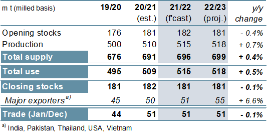 Поскольку прогнозируются более высокие урожаи у азиатских экспортеров, мировое производство риса в 2022/23 году оценивается на рекордном уровне в 518 млн тонн, что несколько выше, чем в прошлом году. В основном в связи с ростом населения, но с относительно более низкими ценами по сравнению с альтернативами, потенциально поддерживающими спрос, прогнозируется новый пик потребления. Остатки ожидаются без изменений по сравнению с прошлым годом, поскольку рост у основных экспортеров, в первую очередь Индии, компенсирует падение запасов Китая. Ожидается, что в 2023 году торговля останется на высоком уровне за счет спроса в Африке.