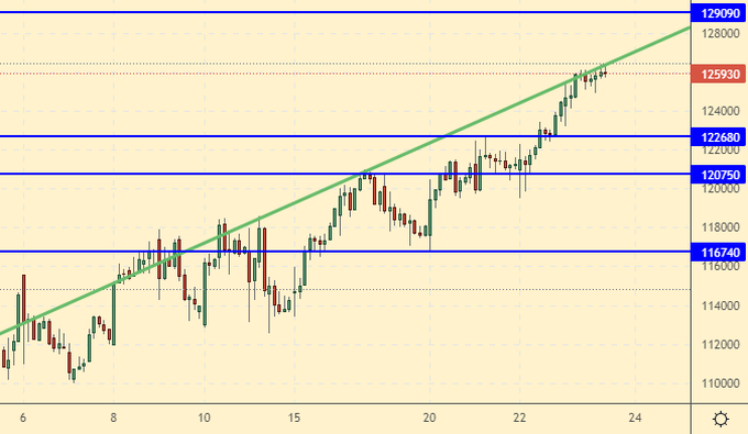Рубль укрепляется, индекс растет. Также укрепляется Сбербанк несмотря на то, что дивидендов за 2021-й год не будет. Остальной рынок демонстрирует желание расти, но покупателей нет. От 129000 шорт обязателен.