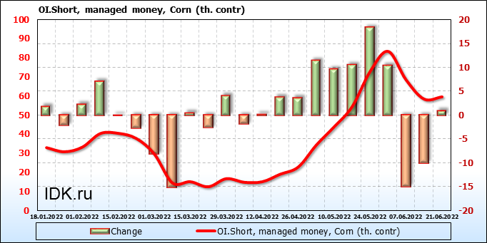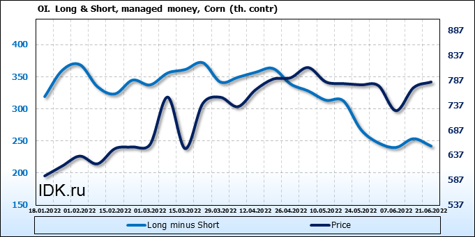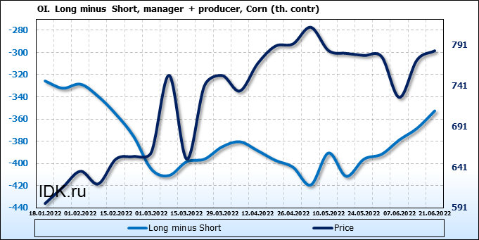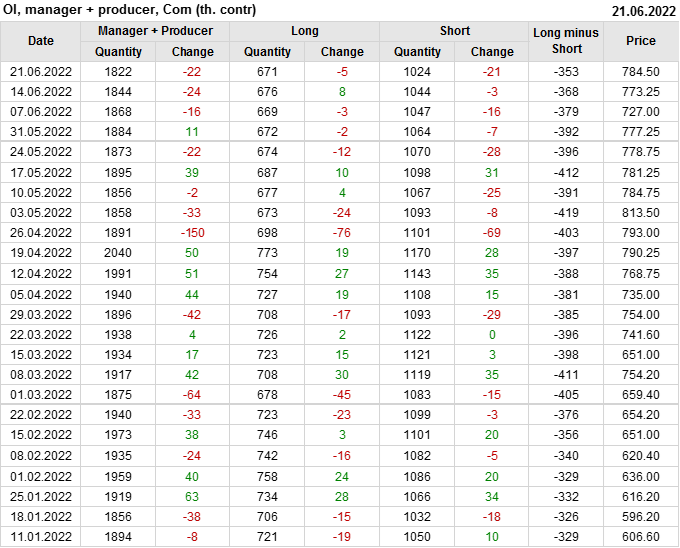За прошлую неделю, 15.06.22 — 21.06.22, разница между длинными и короткими позициями управляющих сократилась на 11.5 тыс. контрактов. В тоже время, цена выросла на 11.25 цента.