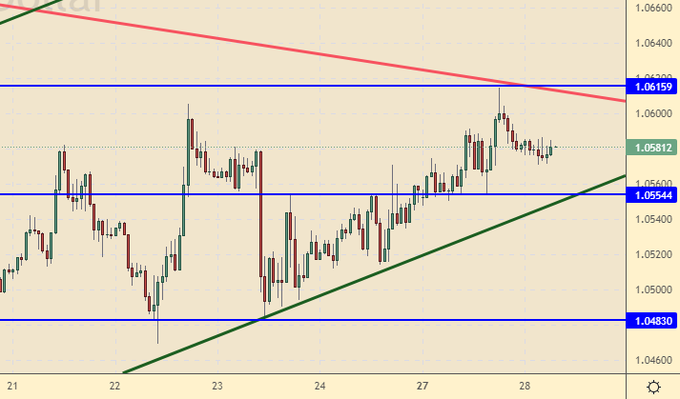 Быки пытаются протолкнуть рынок выше 1.0600, но вряд ли даже в этом случае они получат поддержку от толпы. Дела в США не так и плохи судя по продажам новых домов, и по заказам на товары длительного пользования, которые вышли вчера лучше прогноза.