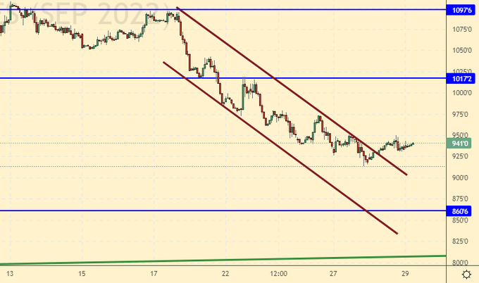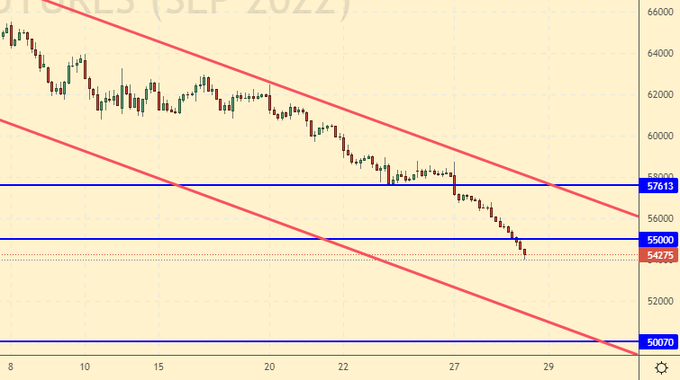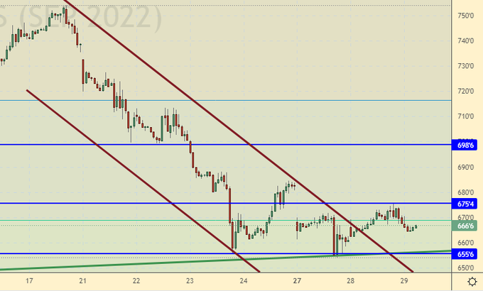 Пока идея о том, что мы ударим в 600.0 продолжает оставаться актуальной. Если будут получены гарантии экспорта украинского зерна, то мы, действительно, сможем пройти ниже. В целом же на рынке пока много быков, судя по объемам открытых позиций, поэтому разворот с текущих уровней вверх не удивит.