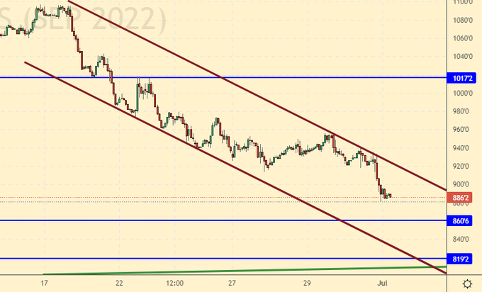 Рынок пшеницы дисциплинированно движется к обозначенному нами ранее уровню 860.0. Ход на 820.0 также возможен, но вряд ли это произойдет в рамках текущего падения. Скорее всего от 860.0 будет отскок вверх. Есть сомнения в том, что июльский прогноз USDA по валовому сбору будет таким же оптимистичным, как и июньский. История с дефицитом удобрений должна негативно сказаться на урожайности.