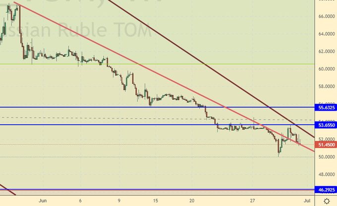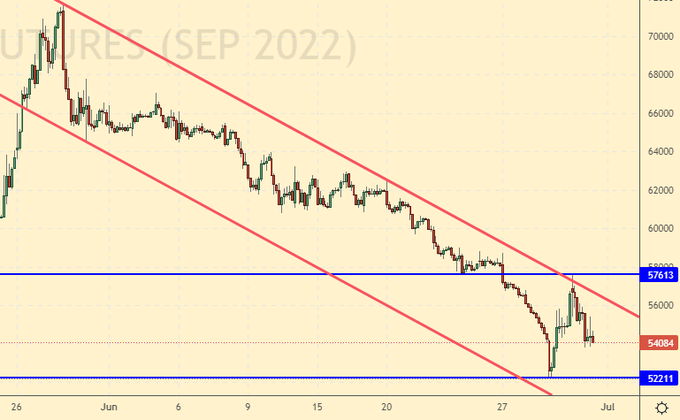 Видим красивые размашистые ценовые ветки. Пока структура смотрит вниз. И в целом мы находимся внутри падающего канала, поэтому торопиться с размышлениями о развороте рынка вверх не будем.