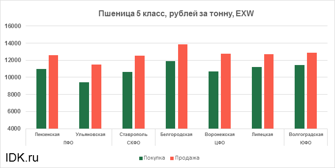 За прошедшую неделю с 27.06.2022 по 01.07.2022 средняя цена на пшеницу 5-го класса, согласно выставленным заявкам трейдеров, упала по всем округам на 423 рубля. Средняя цена составляет 11758 рублей за тонну.