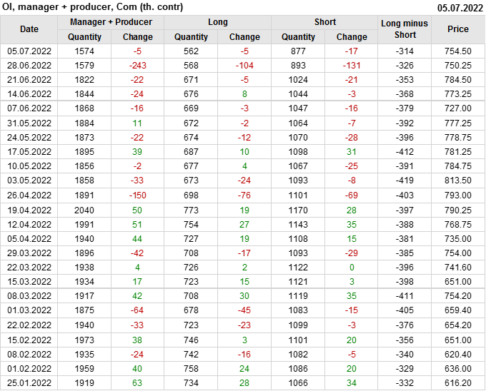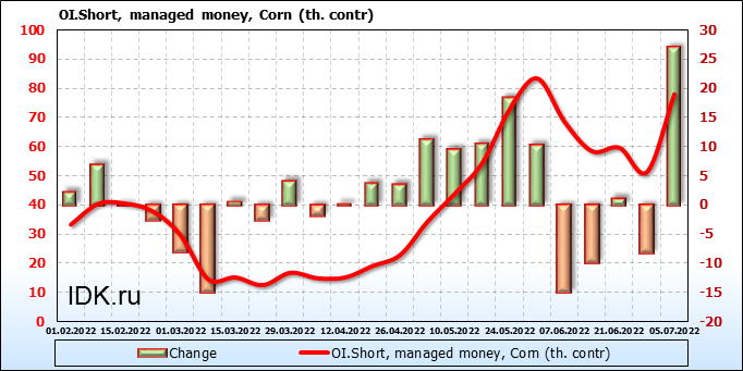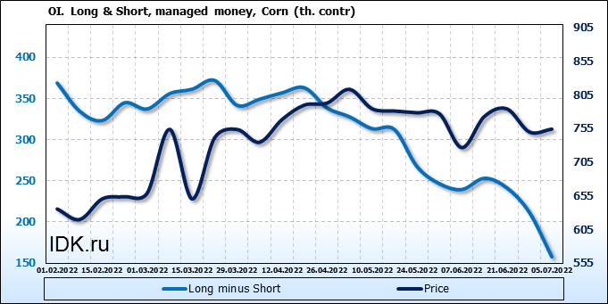 За прошлую неделю, 29.06.22 — 05.07.22, разница между длинными и короткими позициями управляющих сократилась на 54 тыс. контрактов. В тоже время, цена выросла на 4.25 цента.