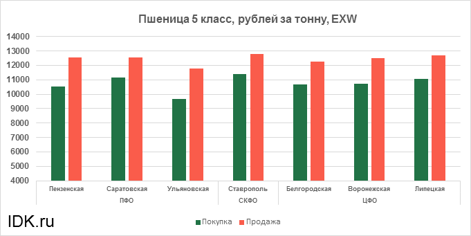 За прошедшую неделю с 04.07.2022 по 08.07.2022 средняя цена на пшеницу 5-го класса, согласно выставленным заявкам трейдеров, выросла по всем округам на 68 рублей. Средняя цена составляет 11697 рублей за тонну.
