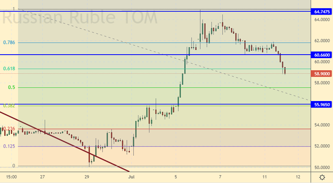 За счет укрепления рубля индекс РТС вырос вчера, при этом рублевый индекс ММВБ продолжил падение, что ясно говорит нам о том, что оптимизма на рынке нет. Мы плавно подходим к августу месяцу очень нехорошему в российской истории, поэтому не будет ничего удивительного если фондовый рынок просто свалится на низы. Ждем Сбербанк по 60.00, там покупаем.