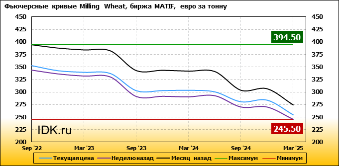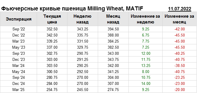 На 11.07.2022 стоимость пшеницы Milling Wheat на бирже MATIF по контракту Sep ’22 составила 352.5 евро за тонну. За прошедшую неделю стоимость пшеницы Milling Wheat выросла на 9.25 евро/тонна. Как мы видим на графике, фьючерсная кривая имеет периоды, когда более дальний фьючерс дешевле ближнего. Состояние бэквардации наблюдаем на следующих контрактах: Dec ’22; Mar ’23; May ’23; Sep ’23; May ’24; Sep ’24; Mar ’25. Таким образом, трейдеры предполагают, что возможно превалирование предложения над спросом в указанные периоды.