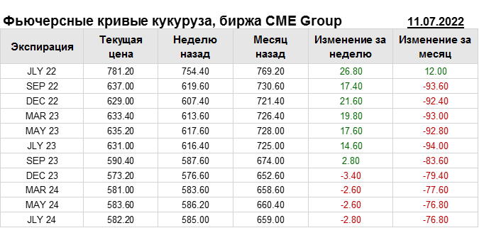 На 11.07.2022 стоимость кукурузы на бирже CME Group по контракту JLY 22 составила 781.2 цента за бушель. За прошедшую неделю стоимость кукурузы на площадке CME Group выросла на 26.8 цента/бушель. Как мы видим на графике, фьючерсная кривая имеет периоды, когда более дальний фьючерс дешевле ближнего. Состояние бэквардации наблюдаем на следующих контрактах: SEP 22; DEC 22; JLY 23; SEP 23; DEC 23; JLY 24. Таким образом, трейдеры предполагают, что возможно превалирование предложения над спросом в указанные периоды.