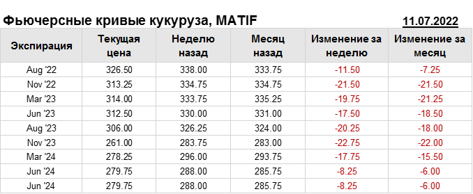 На 11.07.2022 стоимость кукурузы на бирже MATIF по контракту Aug ’22 составила 326.5 евро за тонну. За прошедшую неделю стоимость кукурузы на европейской площадке упала на 11.5 евро/тонна. Как мы видим на графике, фьючерсная кривая имеет периоды, когда более дальний фьючерс дешевле ближнего. Состояние бэквардации наблюдаем на следующих контрактах: Nov ’22; Jun ’23; Aug ’23; Nov ’23. Таким образом, трейдеры предполагают, что возможно превалирование предложения над спросом в указанные периоды.