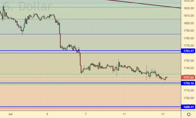 Продавцы продолжают проталкивать рынок вниз. В случае падения ниже 1720 нас ждет быстрый спуск к 1690, где возможен некоторый отскок вверх. До конца июля позиции доллара будут оставаться сильными, поэтому и золото еще пару недель не должно предпринимать попыток роста.