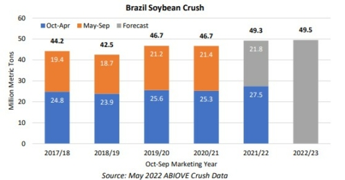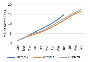 В этом месяце объем производства бразильской сои в 2021/22 году вырос на 750 000 тонн до рекордных 49,3 млн. За первые 7 месяцев года (на основе октября/сентября) Бразилия собрала рекордные 27,5 млн. тонн соевых бобов. Это соответствует увеличению урожая на 9 процентов по сравнению с аналогичным периодом прошлого года, несмотря на то, что урожай на 10 процентов меньше, чем в предыдущем году. Производство бразильской сои продолжает опережать прошлогодний рекорд несмотря на значительные препятствия из-за меньшего урожая, более высоких цен на сою и более низкого, чем ожидалось, уровня производства биодизельной смеси в 2022 году. Вместо этого рекордно высокие цены на нефть и повышение цен на продовольствие привели к тому, что рентабельность бразильского рынка достигла рекордно высокого уровня, что способствовало устойчивому росту. Кроме того, замедление спроса на импорт сои, главным образом из Китая, куда Бразилия обычно поставляет около двух третей импорта бобовых, привело к