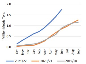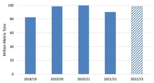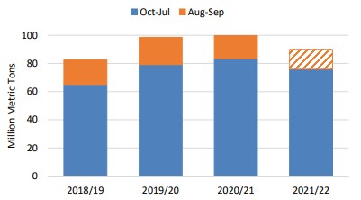 Ограничения, связанные с COVID в Китае, замедление экономического роста и повышение мировых цен на сырьевые товары, ослабили спрос Китая на переработку масличных культур, белковую муку и потребление растительного масла. По этим причинам прогноз производства сои в этом месяце был снижен на 2,0 млн тонн до 87,0 млн в соответствии с дальнейшим снижением потребления белковой муки и пищевого растительного масла в 2021/22 год.