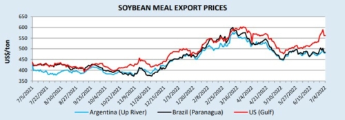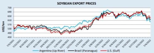 Среднемесячные цены на сою незначительно изменились в июне, при этом цена в США немного выросла, а цена в Бразилии снизилась, и никаких изменений в аргентинской цене. Однако после пика в первой половине месяца цены снизились, особенно в последние дни месяца и в начале июля. Это приводит к тому, что цены на начало июля примерно на 50 долларов за тонну ниже уровня середины июня, при этом цены в США остаются выше южноамериканских. Это снижение отражает недавние потери в кукурузе, пшенице и других сырьевых товарах.